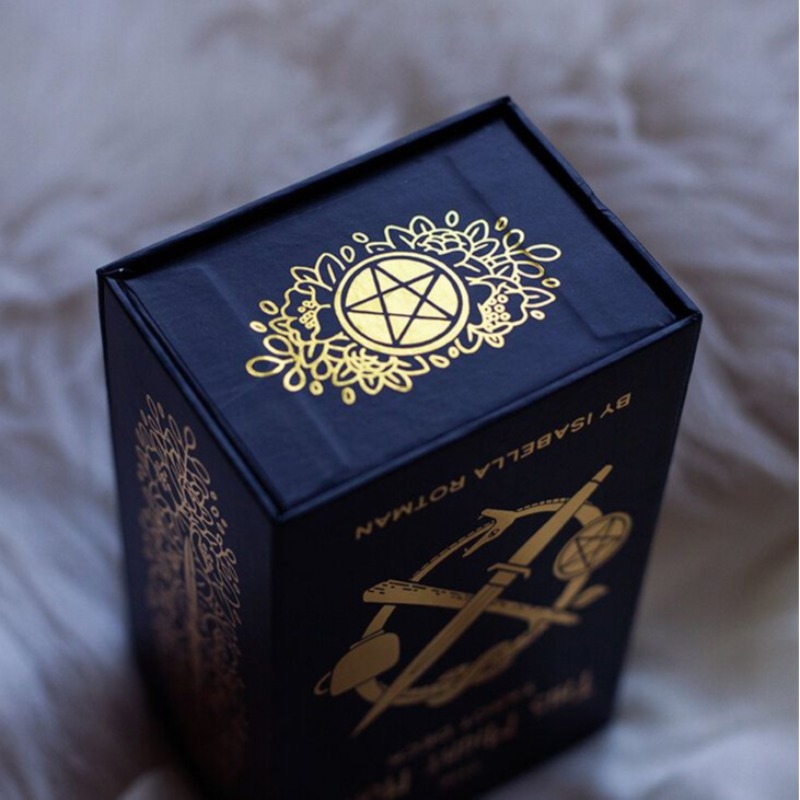 盒子本身是硬身的卡紙,全黑色加上金色熨字和圖案,是很簡約的設計。盒面上和四邊就包含了四元素的象徵 – 杯子(水)、錢幣(土)、刀子(風)和木枝(火)。盒子的右邊有磁石貼作開關,令牌不容易掉出來。