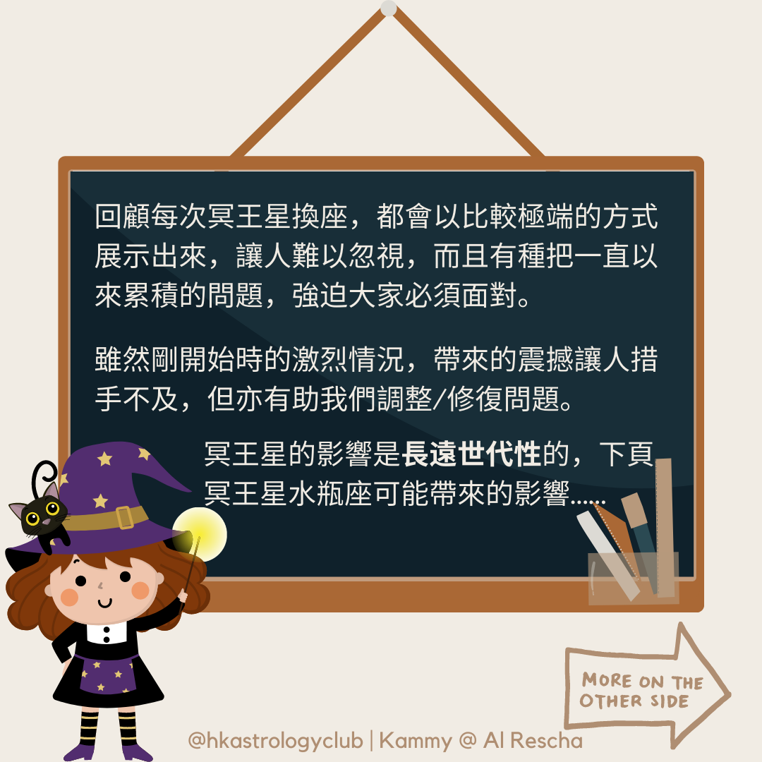 每年運行約1-2度左右,故需根據個人本命盤中的行星/四軸所在實際位置的度數,了解何時開始感受到影響,無需過度擔憂。